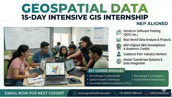 Jumpstart your journey into the world of spatial data with a fast-paced, hands-on internship designed to give you practical, real-world experience in Geographic Information Systems (GIS), fully aligned with the National Education Policy (NEP) guidelines for skill-based learning.